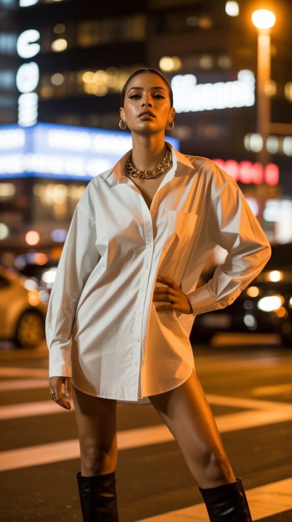 Think of oversized shirts as a styling canvas. Belts, layers, shoes, and accessories completely change the vibe.